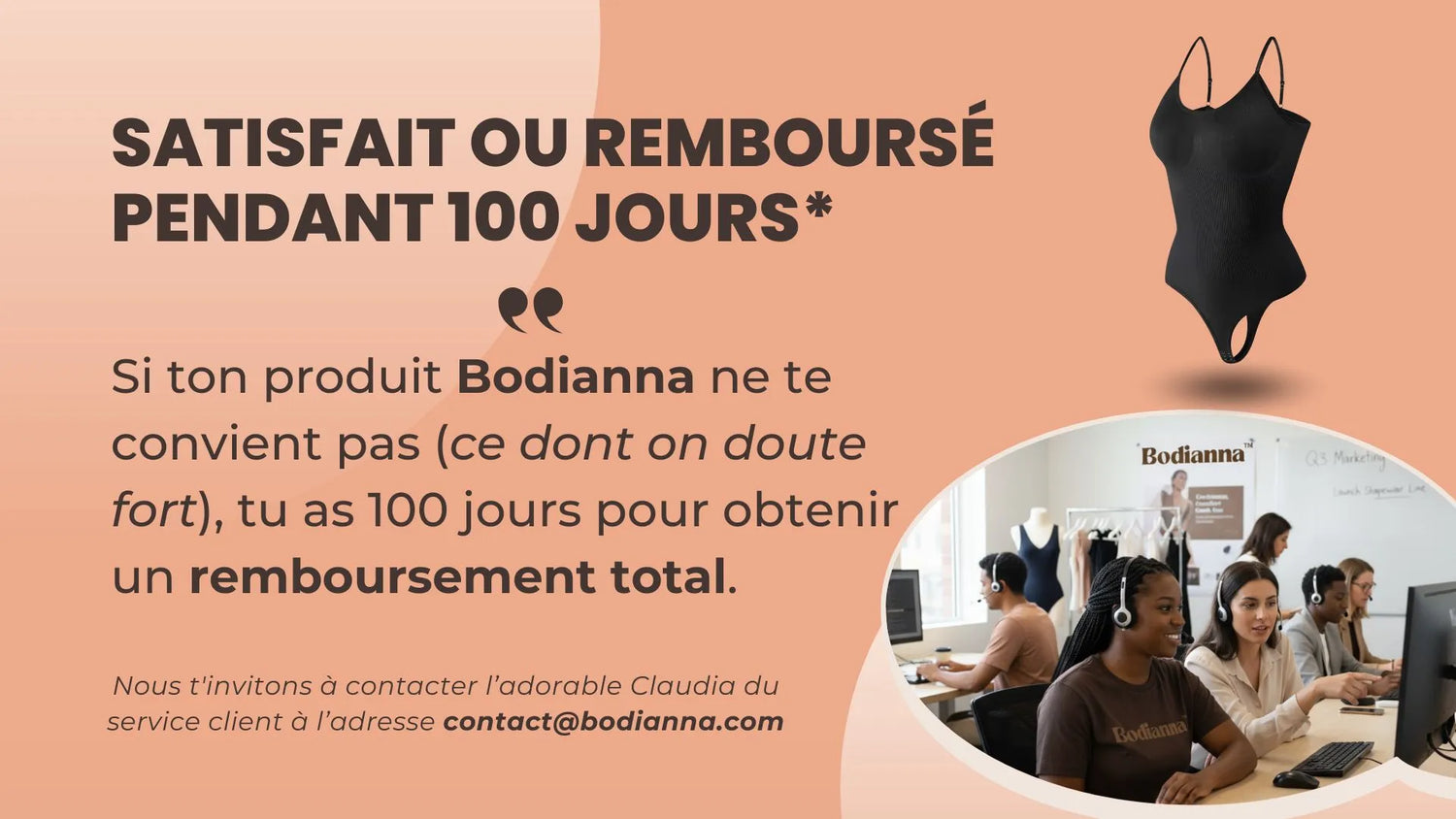 Si ton produit Bodianna ne te convient pas (ce dont on doute fort) , tu as 100 jours pour obtenir un remboursement total. Nous t'invitons à contacter l’adorable Claudia du service client à l’adresse contact@bodianna.com