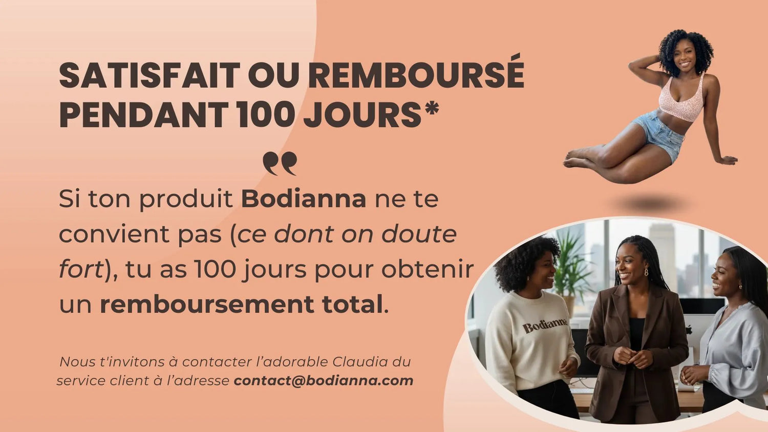 Si ta brassière Bodianna ne te convient pas (ce dont on doute fort) , tu as 100 jours pour obtenir un remboursement total. Nous t'invitons à contacter l’adorable Claudia du service client à l’adresse contact@bodianna.com